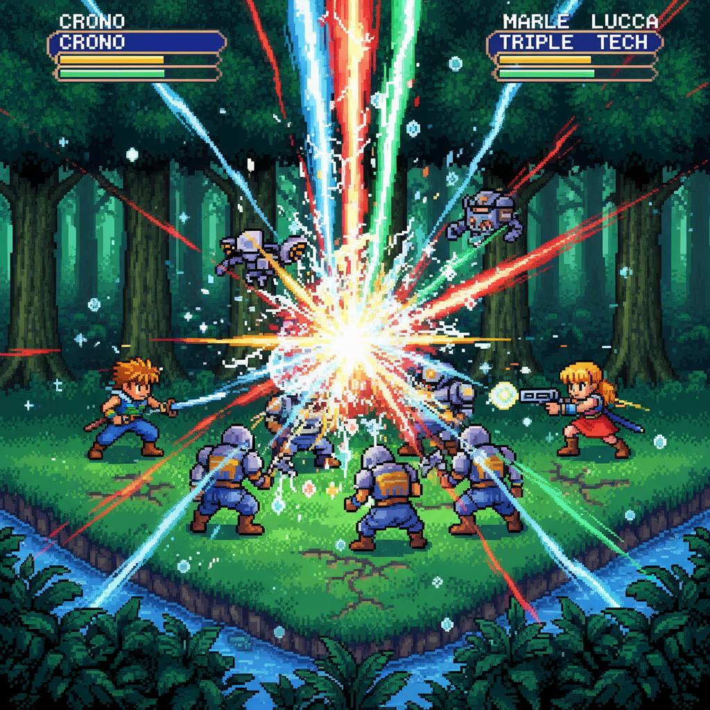 - Crono, Frog e Robo: Excelente para dano físico e defesa. Frog é um excelente curandeiro e atacante, enquanto Robo oferece boa resistência e Techs úteis como “Heal Beam”. A “Triple Kick” deles é devastadora.