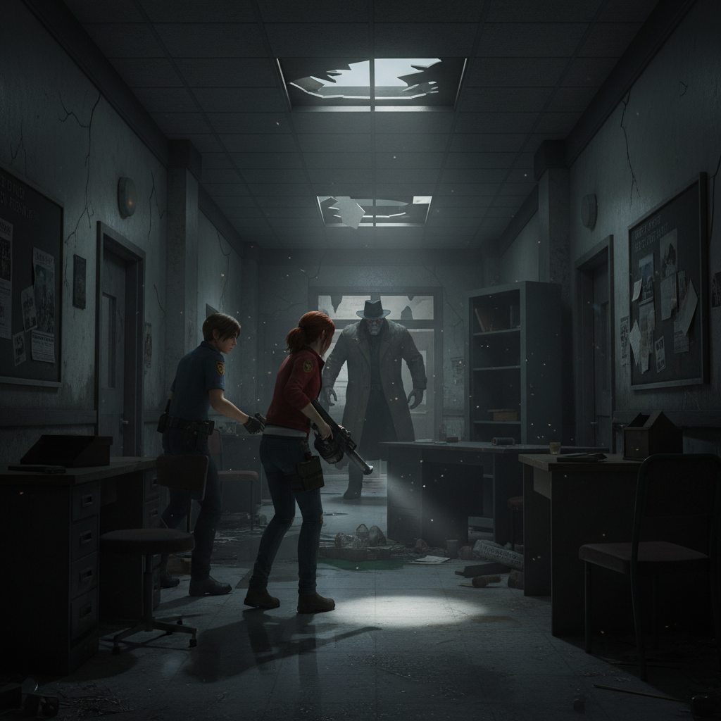 O Cenário da Delegacia: Apesar de fiel, a R.P.D. (Delegacia de Polícia de Raccoon) no remake foi completamente redesenhada para ser mais coesa e desafiadora, com rotas alternativas e áreas que não existiam no jogo original.